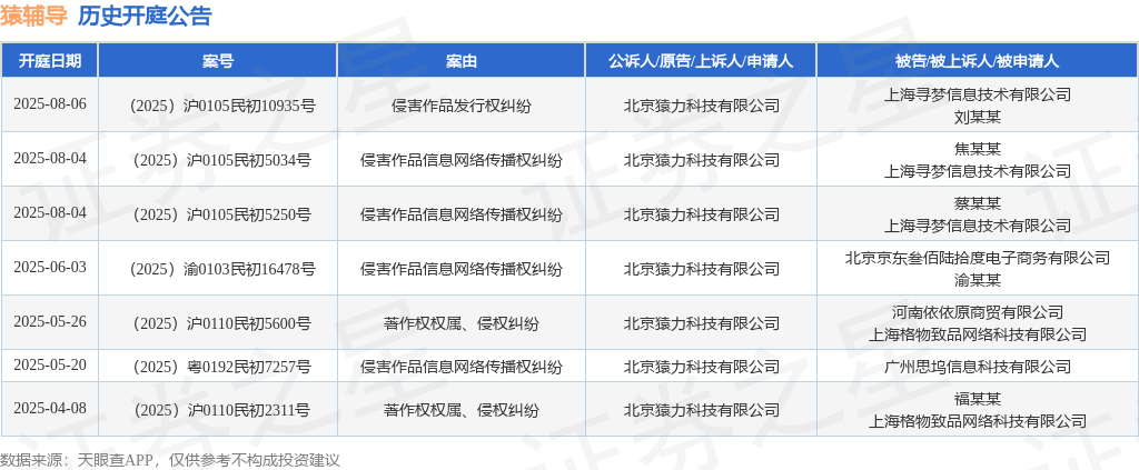 案号:(2025)沪0110民初5600号审理法院:上海市杨浦区人民法院案由:著作权权属、侵权纠纷当事人信息: 原告/上诉人:北京猿力科技有限公司 被告/被上诉人:河南依依原商贸有限公司、上海格物致品网络科技有限公司开庭日期:2025年5月26日根据统计,近一年内以北京猿力科技有限公司为当事人的历史开庭公告有7则,其中案由为“侵害作品信息网络传播权纠纷”的公告以4则居首,其次为“著作权权属、侵权纠纷”有2则,“侵害作品发行权纠纷”有1则。历史开庭公告如下: