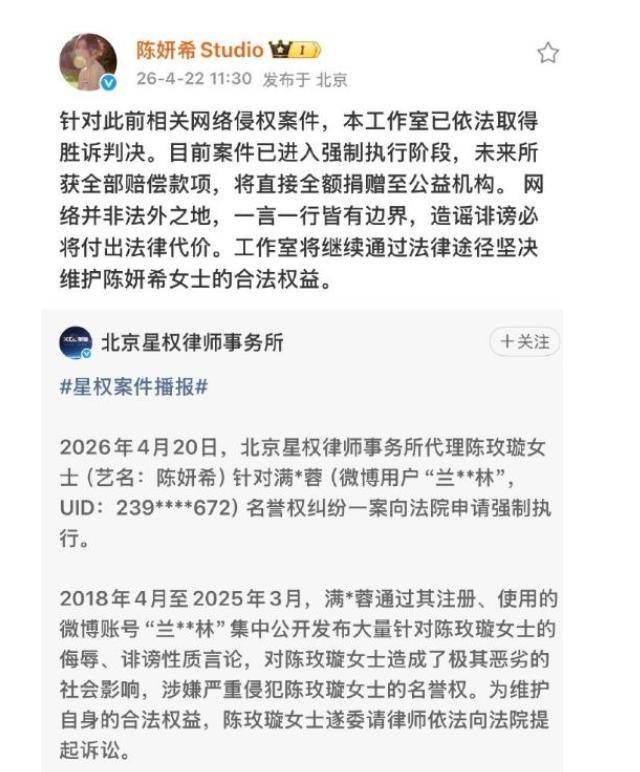 越发是正在4月22日,陈妍希径直向法院递交了强制推广申请,其维权针对的对象,乃是陈晓的一位中枢粉丝。